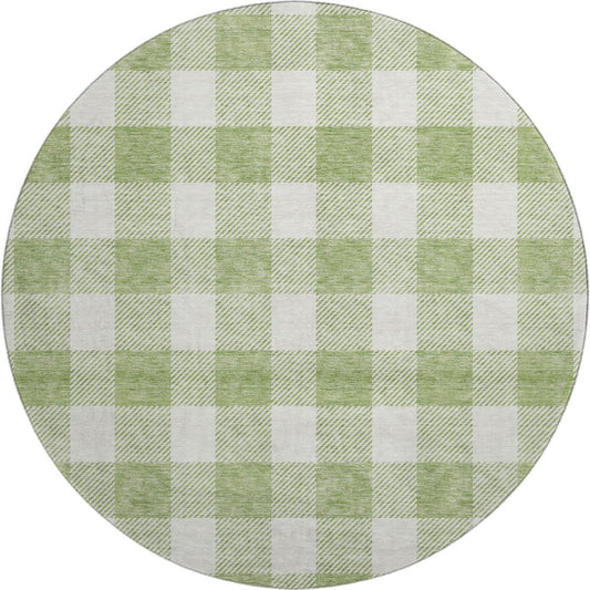 8' Artichoke Green And Ivory Plaid Washable Round Rug With UV Protection