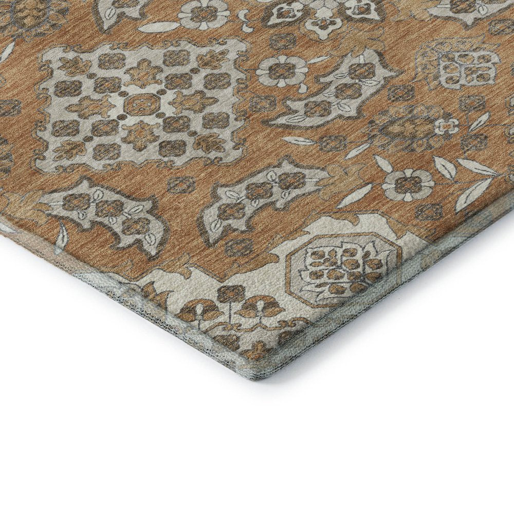 Set an inviting tone in your space with this 5-foot x 8-foot terra cotta and beige floral medallion washable area rug with uv protection. Ideal for spaces with kids and pets, this rug is stain resistant to help repel dirt and spilled liquids. Built to last, this rug crafted from polyester fibers is known for its durability and long lasting appeal. Rugs are a great way to showcase your style, hide imperfections, warm your home and reduce noise. This larger sized, traditional styled rug is ready to create a focal point or statement piece in your room. 60.00-inch h x 90.00-inch w x 0.39-inch d.