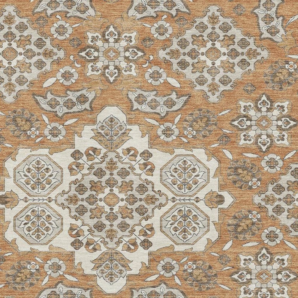 5' X 8' Terra Cotta And Beige Floral Medallion Washable Area Rug With UV Protection