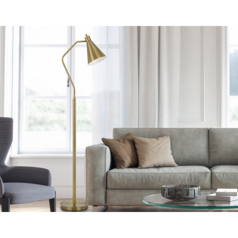 Truly a mix of design and functionality that doesn't compromise on style, this 63-inch antiqued brass metal reading floor lamp with antiqued brass metal cone shade will be a great addition to your space. The lamp is made of sturdy metal and features a brass color. The brass base coloring infuses a warm and rich tone to your space. This good looking lamp includes a metal cone shaped shade. Next to your desk or favorite chair this single base task/reading lamp is designed to make your work or activities easier with concentrated light in just the space you need it. The light that this lamp throws is soft and warm to elevate the look of most any space in your home. Bring some lite and good vibes into your space with this updated and stylishly designed lamp. 63-inch h x 11-inch w x 20-inch d.