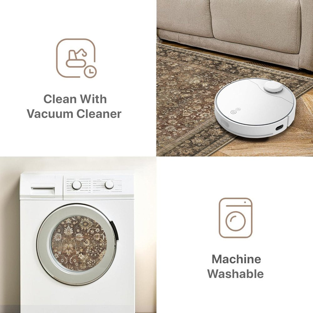 8' Brown Ivory And Tan Floral Medallion Washable Runner Rug