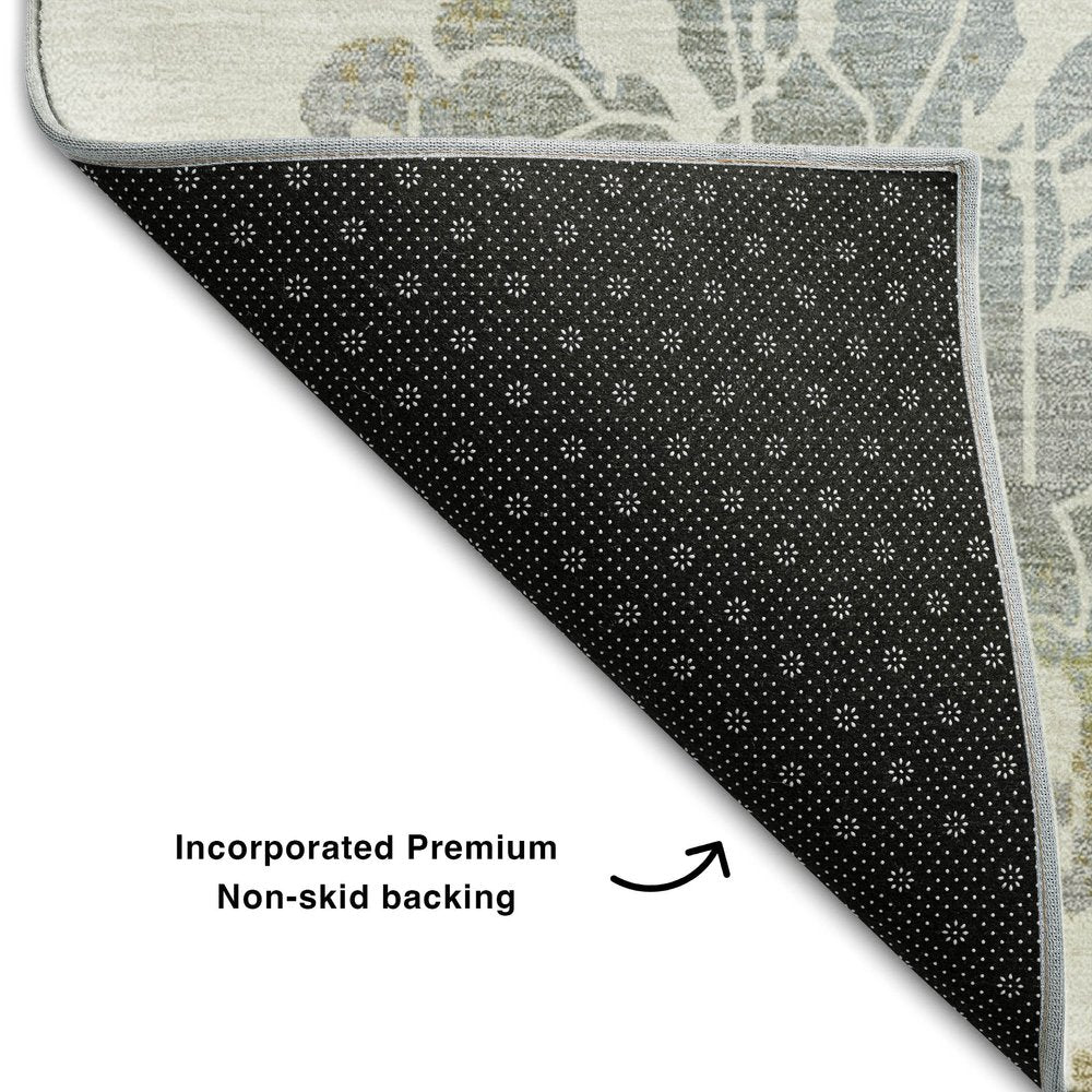 Set an inviting tone in your space with this 8-foot ivory gray and gold floral washable round rug with uv protection. Ideal for spaces with kids and pets, this rug is stain resistant to help repel dirt and spilled liquids. Built to last, this rug crafted from polyester fibers is known for its durability and long lasting appeal. Rugs are a great way to showcase your style, hide imperfections, warm your home and reduce noise. This larger sized, transitional styled rug is ready to create a focal point or statement piece in your room. 96.00-inch h x 96.00-inch w x 0.39-inch d.